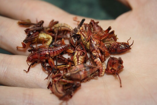 We are eating at the market in Oaxaca at a shared table with locals. We had noticed earlier that day that many vendors sell Chapolines, which are spicy roasted grasshoppers. The man next to Paula had just bought a bag from one of the many roaming vendors. Paula all of sudden asks him if they are bueno.