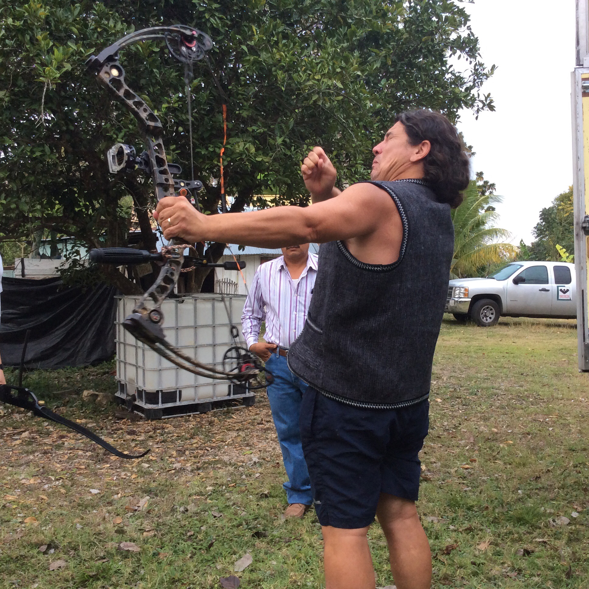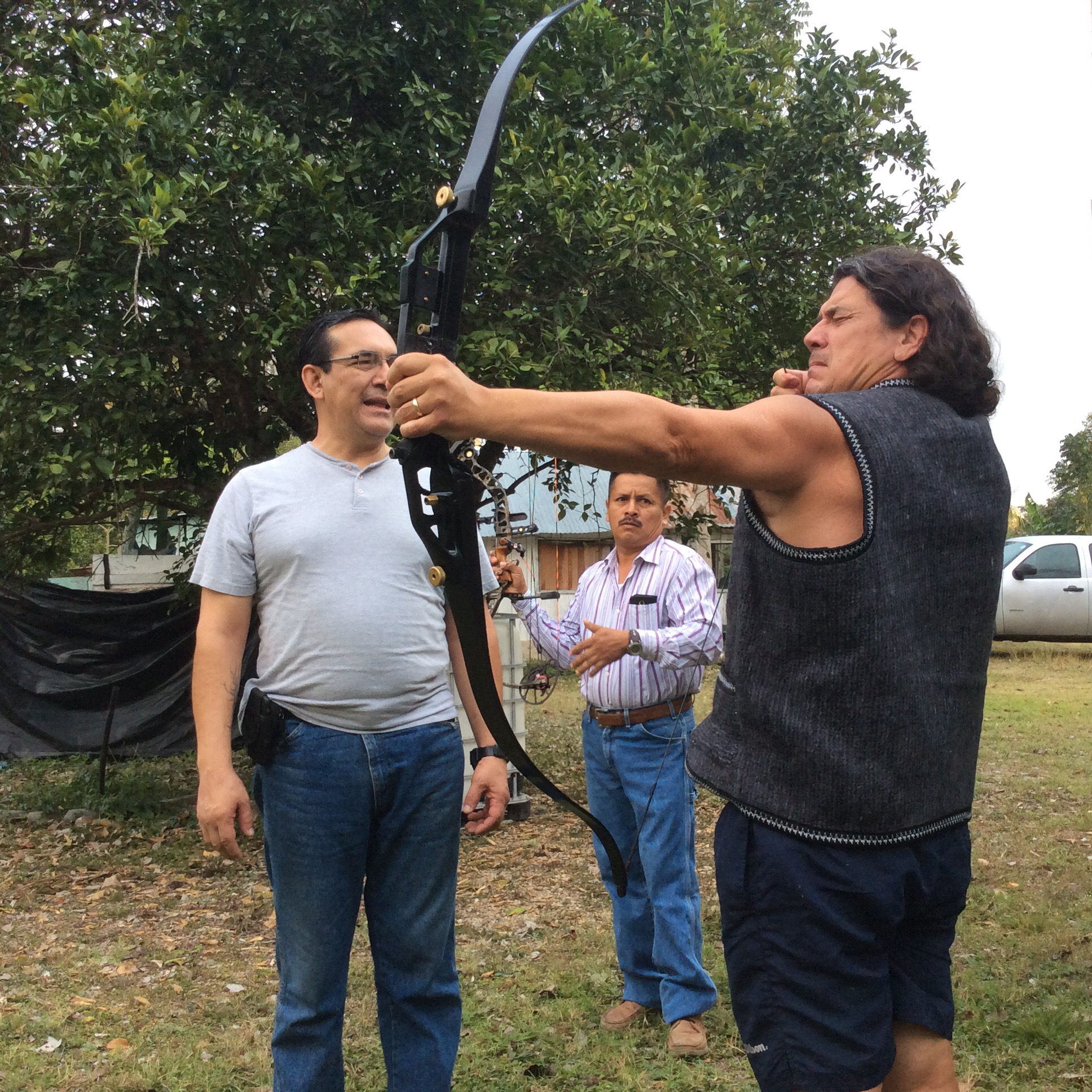 Jorge brings over two bows. One is a longbow, the other is a compound. He hands me the longbow. He says it is a sixty pound bow. He tells me to use three fingers.