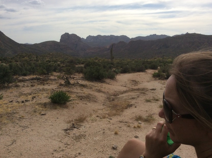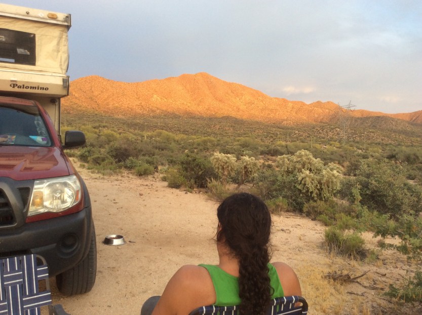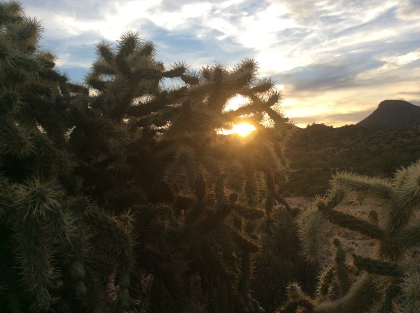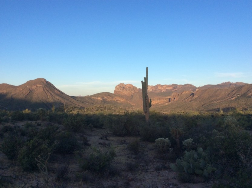 We are alive and in the desert. We are camping for free. The wind is warm, and normally it would be soothing. Normally, except that right now I am fighting off a sinus cold and I am miserable. I shouldn’t be. I should be thankful to be alive and sitting here in the middle of nowhere. The sun will be setting soon oven cliffs and craggy mountains, over a canyon I do not know the name of. It is even now casting it’s last rays of the day against the prickly pears, against the enormous saguaros, against other cactus I also cannot name.