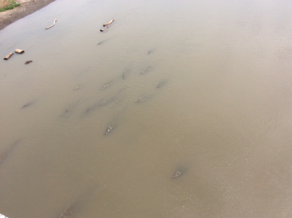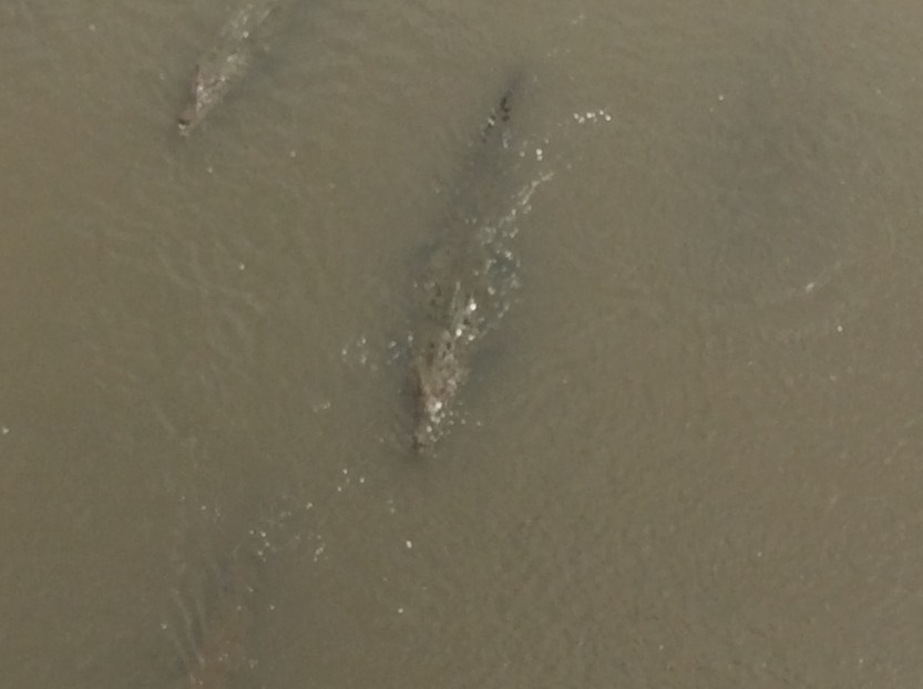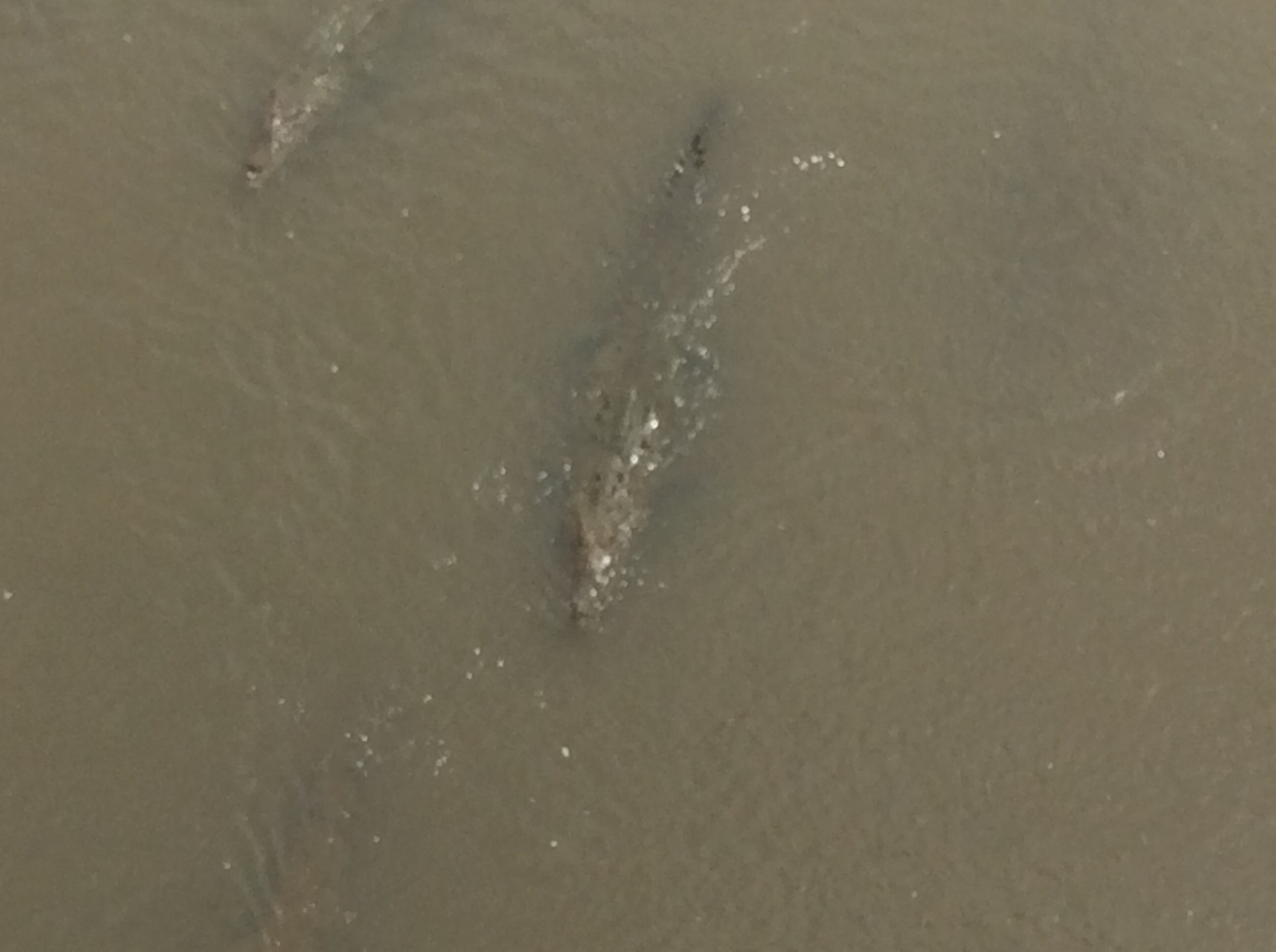 Look down off the bridge over Rio Tarcoles in Costa Rica. It is maybe fifty feet or more to the dirty brown water. See something monstrous emerge out of the brown, something with a head as big as my body. It is a crocodile.
