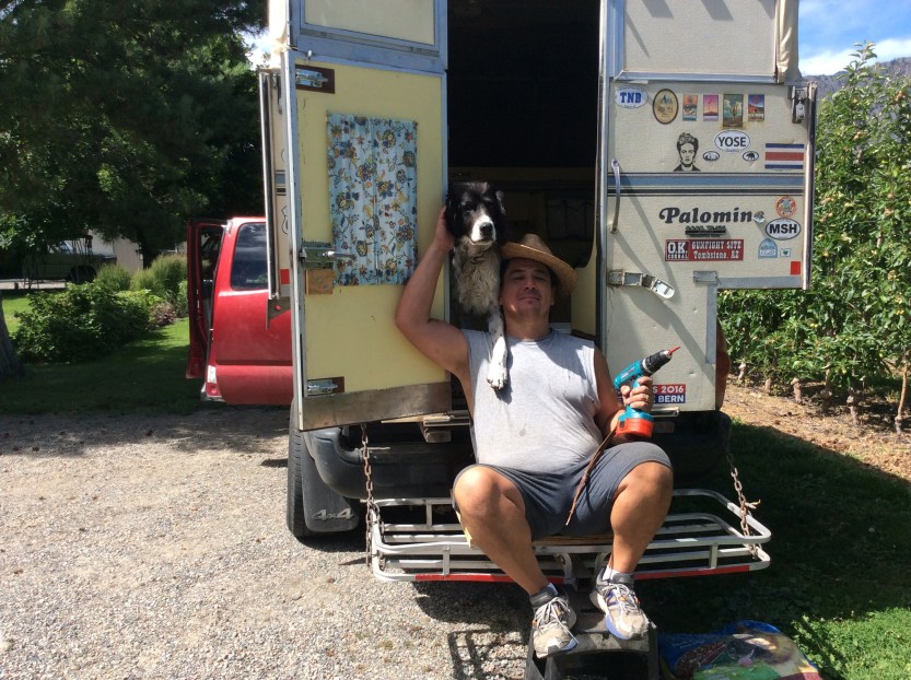 Hello from the Similkameen Valley, in beautiful British Columbia! The sun is shining, the cherries are nearly ripe and life is sweet. We are enjoying visiting family and friends….and it has not been too difficult to adjust to sleeping in a real bed. As you can see in the photo, Finn is helping his master make a few modifications/repairs on our hardworking little camper.