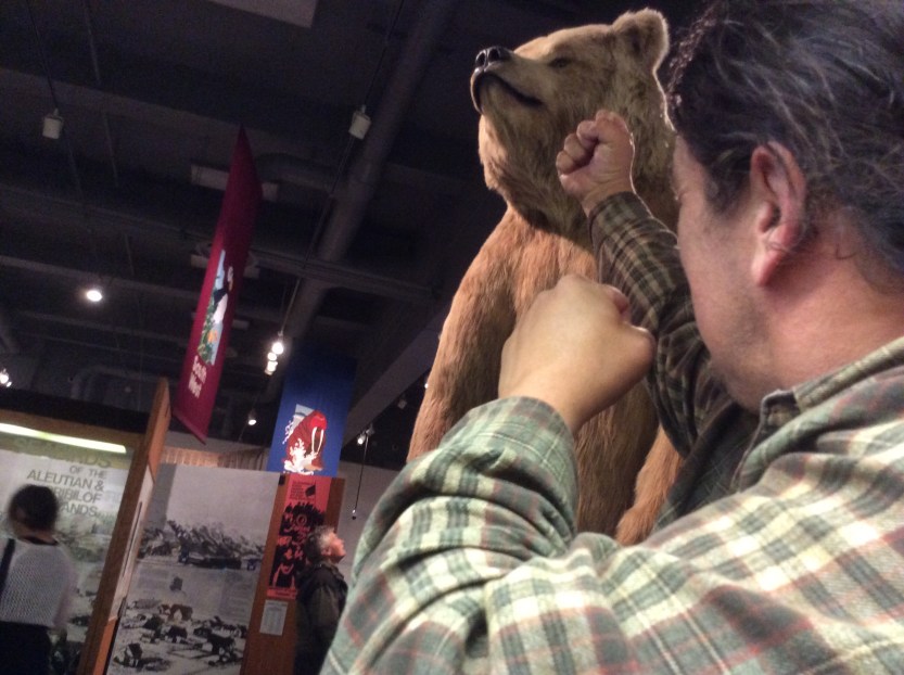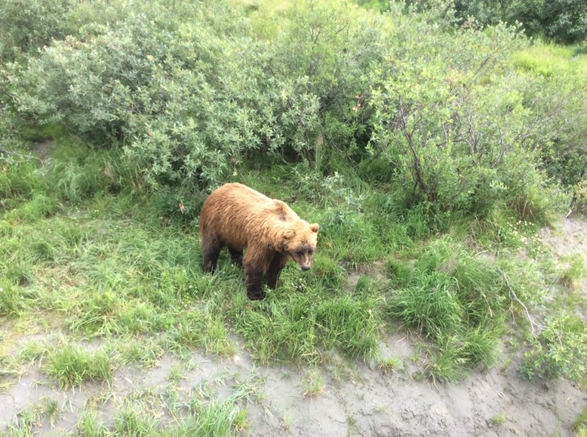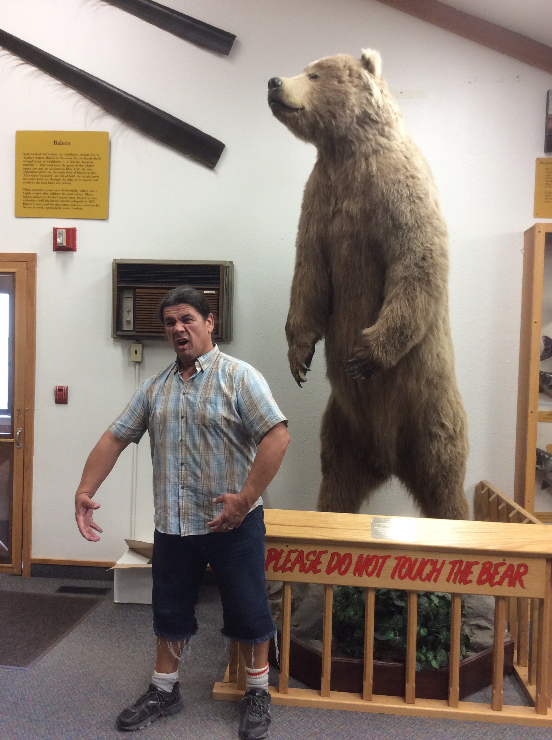 We saw many stuffed Grizzlies, or Brown Bears, as they are called here. The dead ones were even larger than the live ones. However a live one did take a hiker’s backpack a couple of hour before we arrived at a closed trail in Denali National Park.